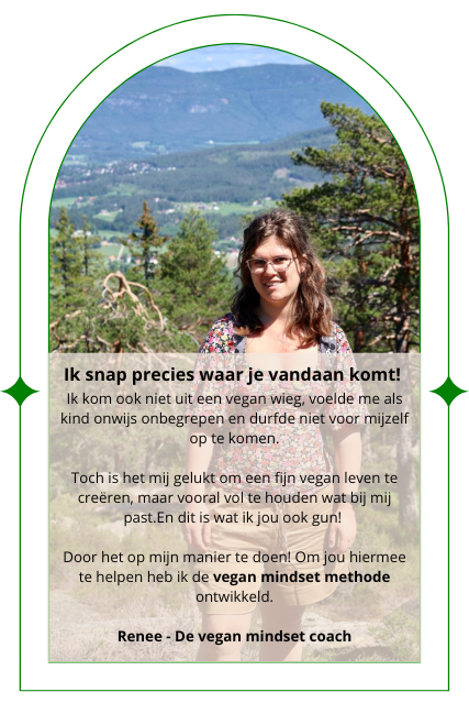 “Hoe fijn is het om met iemand vrij te kunnen praten over het leven als vegan in een niet-vegan wereld. Vooral omdat Renee de uitdagingen kent én niet oordeelt!”