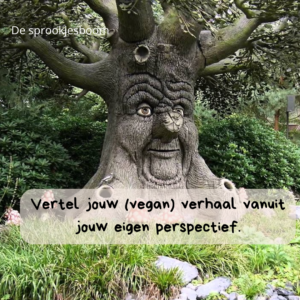 Dus net als wanneer de sprookjesboom zijn verhaal vertelt op zijn manier, mag jij dit ook doen. Deel jouw vegan verhaal met de wereld. Jouw kijk op waarom het belangrijk voor je is bepaalde producten of activiteiten wel of niet te nemen.